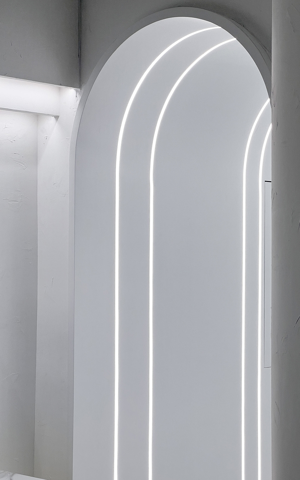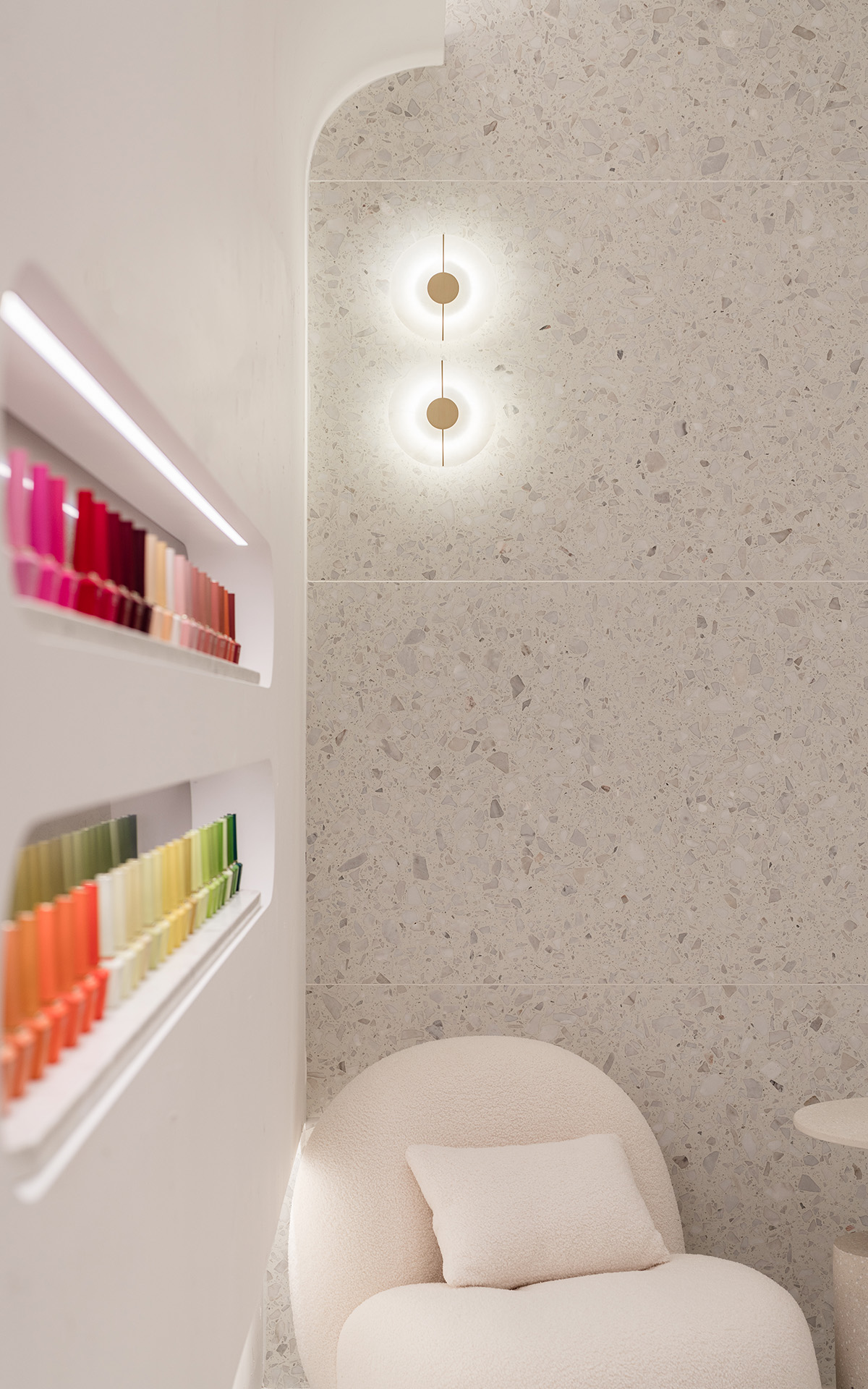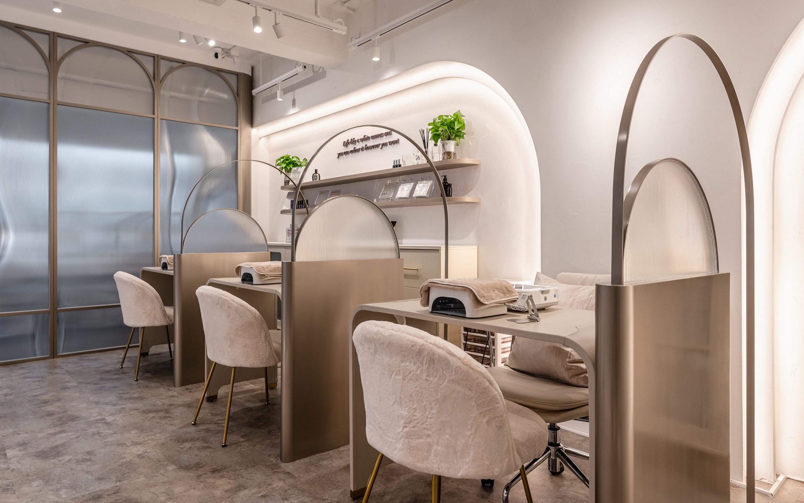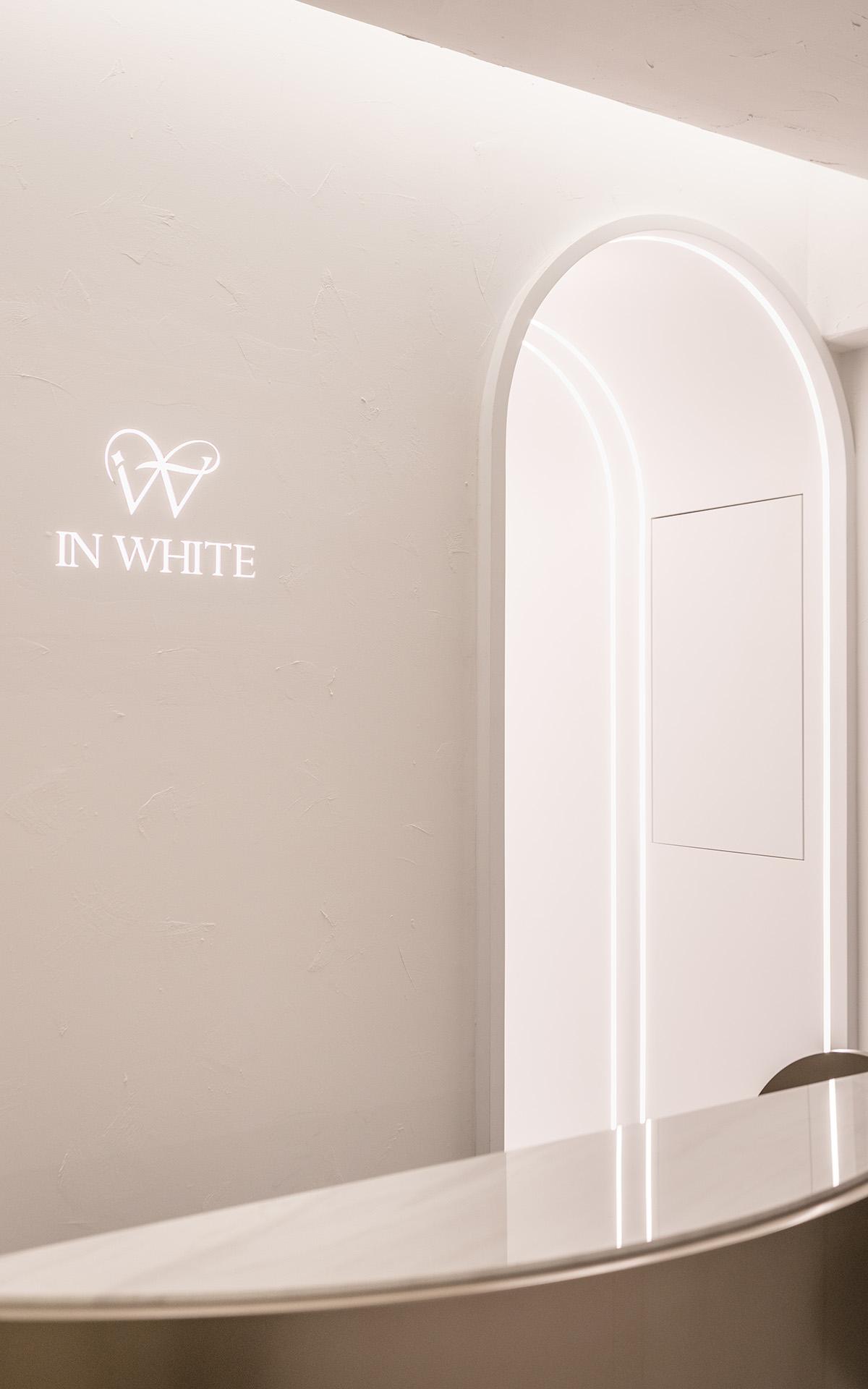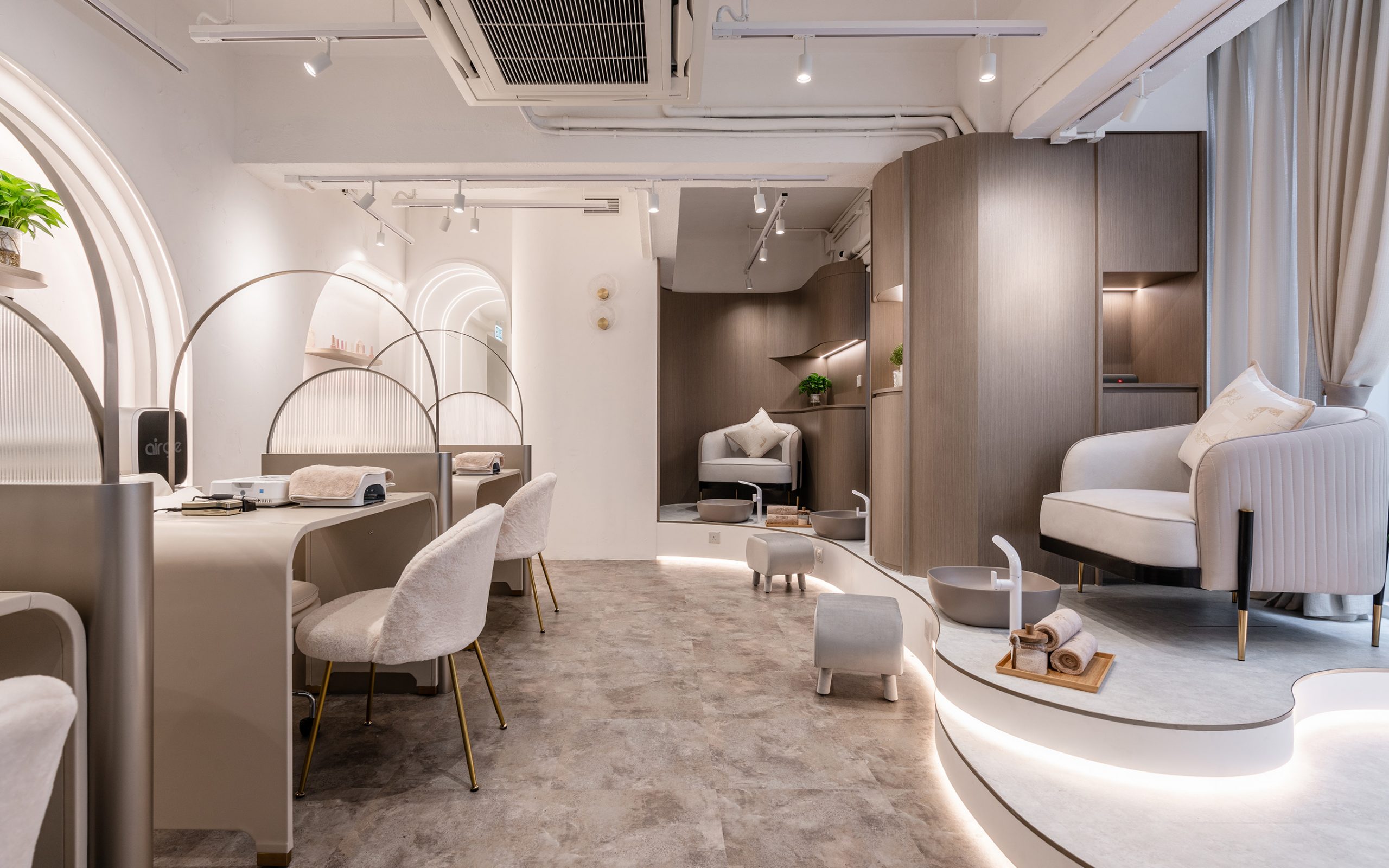 “Inwhite”, the color white always evokes a gentle and pure feeling. As for the design creating a tunnel of white light from the entrance to the shop. It implies to hope that every lady passing through this tunnel can transform into an exquisite and beautiful state with a relaxed mindset. The interior space is designed to be comfortable, elegant, and a source of spiritual healing. The curvy interior design language at the feet spa area, as if enjoying a soothing experience on the surface of a tranquil lake. The soft yet powerful curves reflect the unique beauty that emanates from women. Marble, terrazzo, wood, and pattern glass, are the main material that chosen to the interior space which add a sense of luxury and sophistication to the space.
